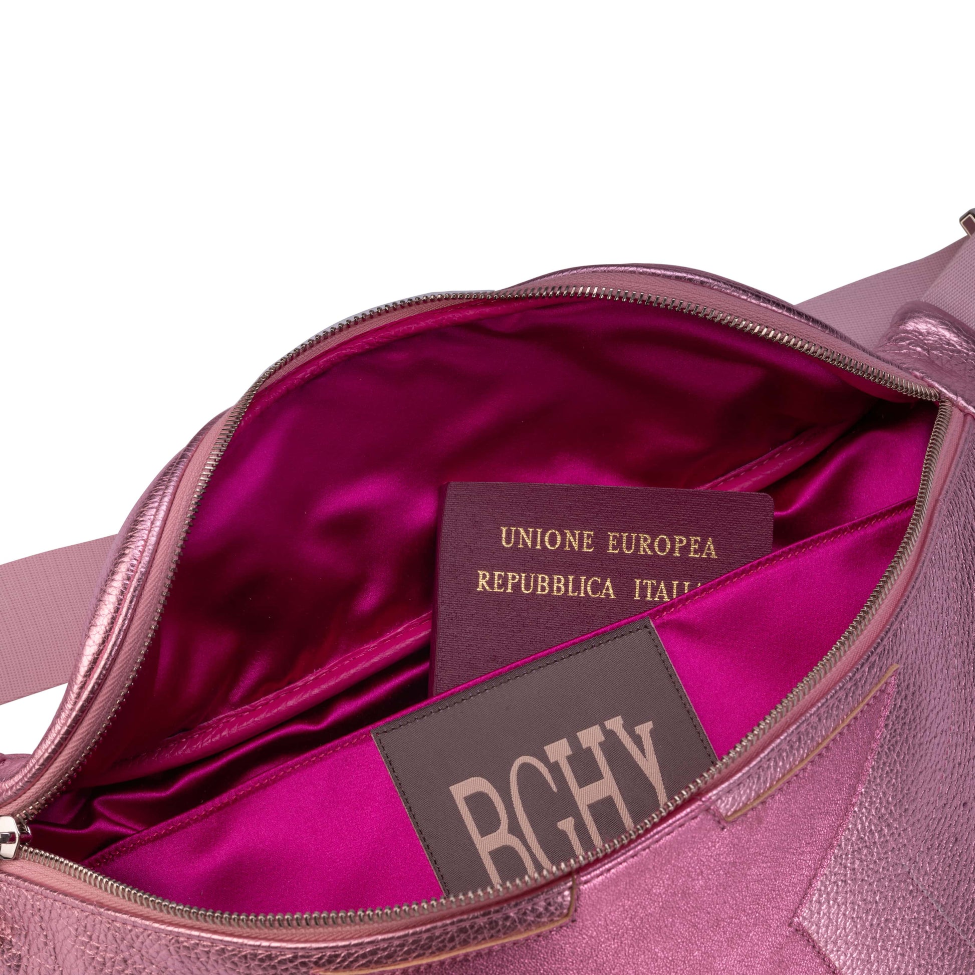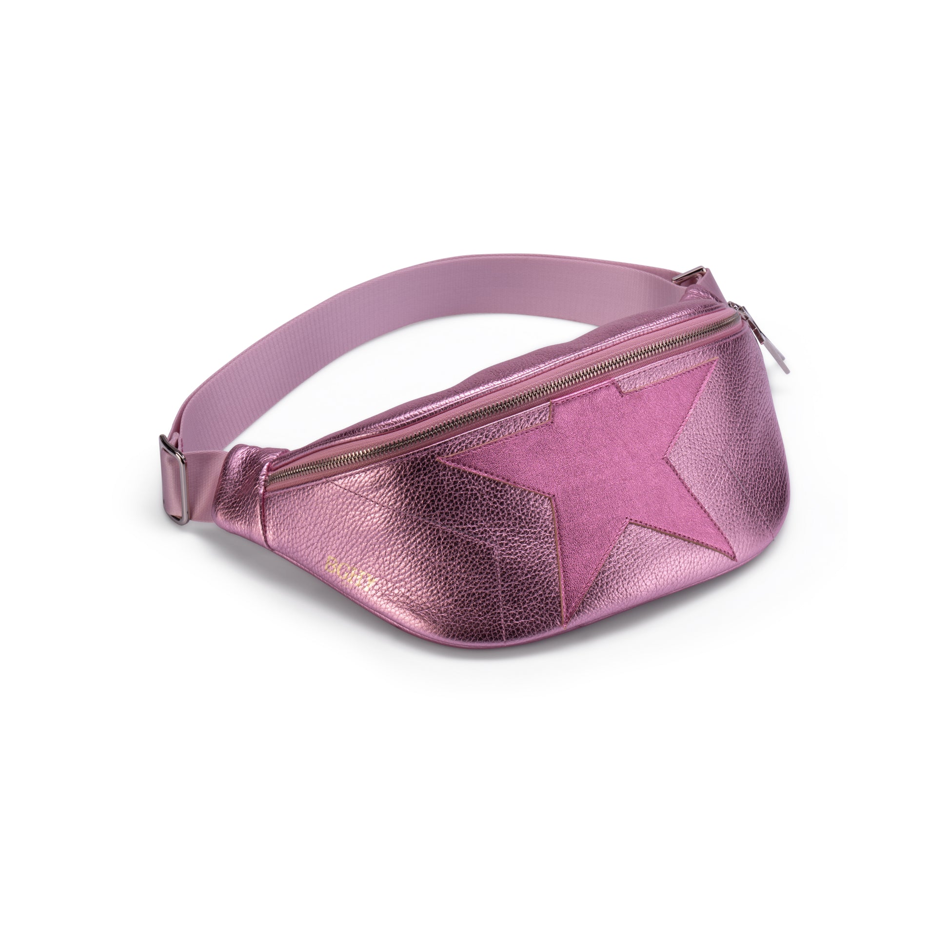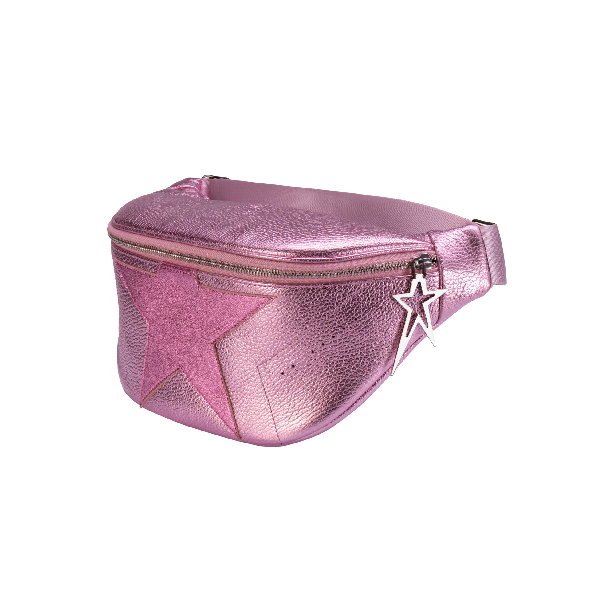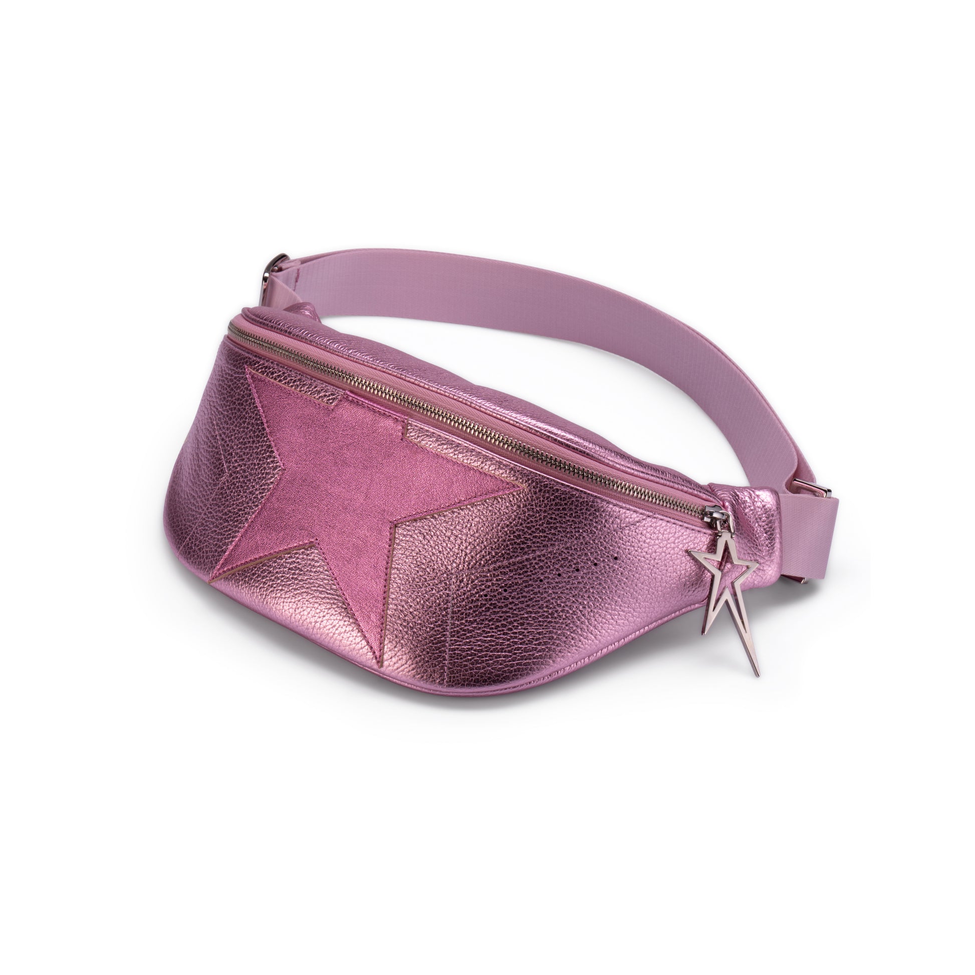 Realizzato in pelle metallizzata Pink, questo marsupio è impreziosito da una stella tono su tono e da accessori personalizzati in metallo.